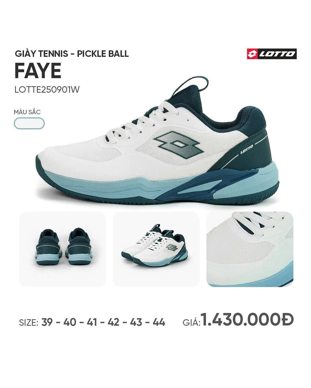 Giày Lotto Faye là đôi giày thể thao đa năng được thiết kế chuyên biệt cho tennis và pickleball, mang đến cảm giác ổn định, linh hoạt và êm ái trong từng bước di chuyển. Phối màu trắng kết hợp xanh pastel tạo nên diện mạo năng động, hiện đại nhưng vẫn tinh giản – phù hợp cả trên sân lẫn ngoài phố.