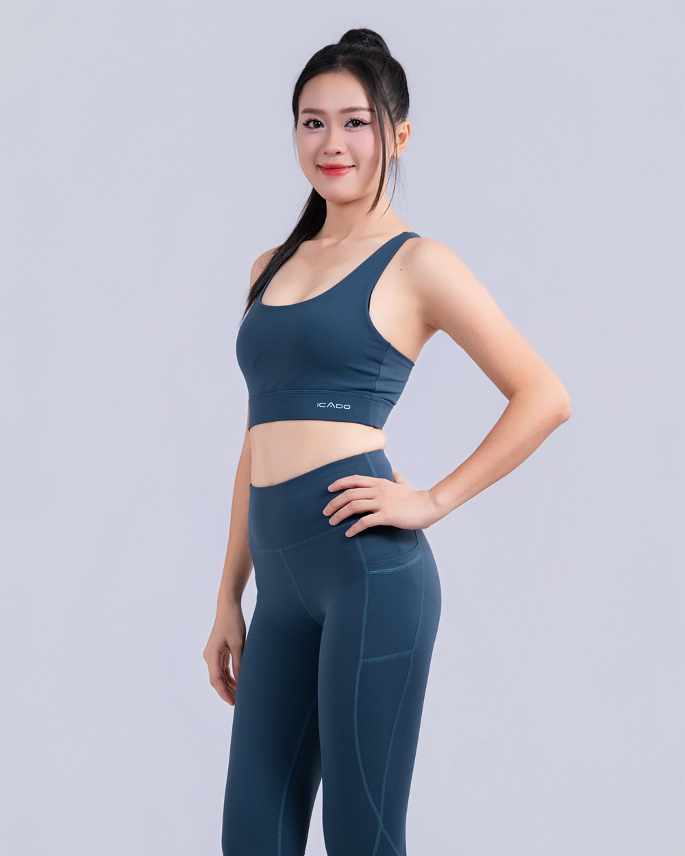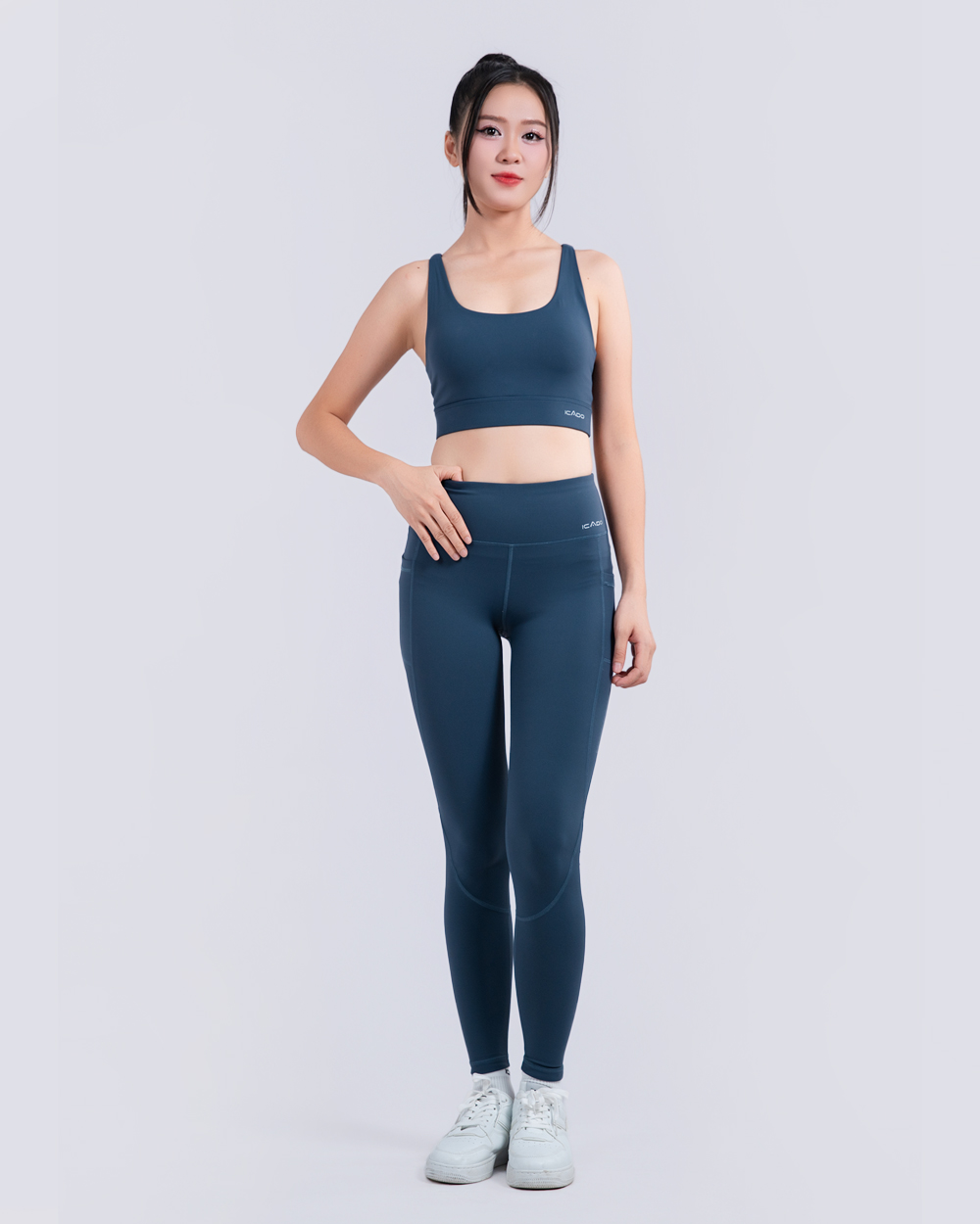 - Quần: Legging dài ôm sát – lưng cao che khuyết điểm vòng eo