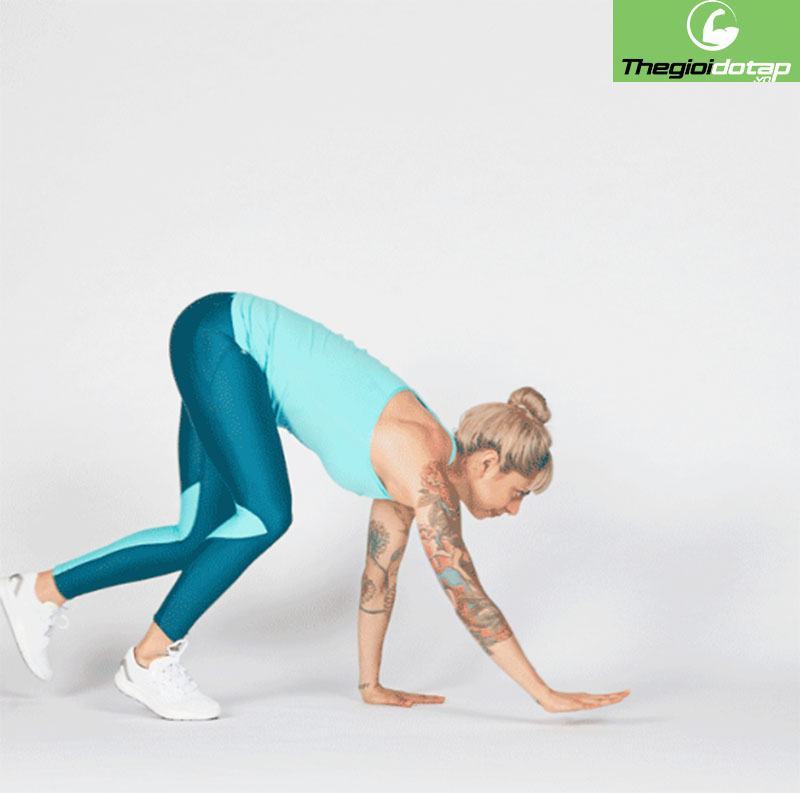 Đặt 2 chân và tay xuống đất, đầu gối không chạm đất. Bò về phía trước bằng cách thực hiện một bước nhỏ với cánh tay phải và chân trái của bạn cùng một lúc và thay thế. Giữ hông thấp và đầu hướng lên.