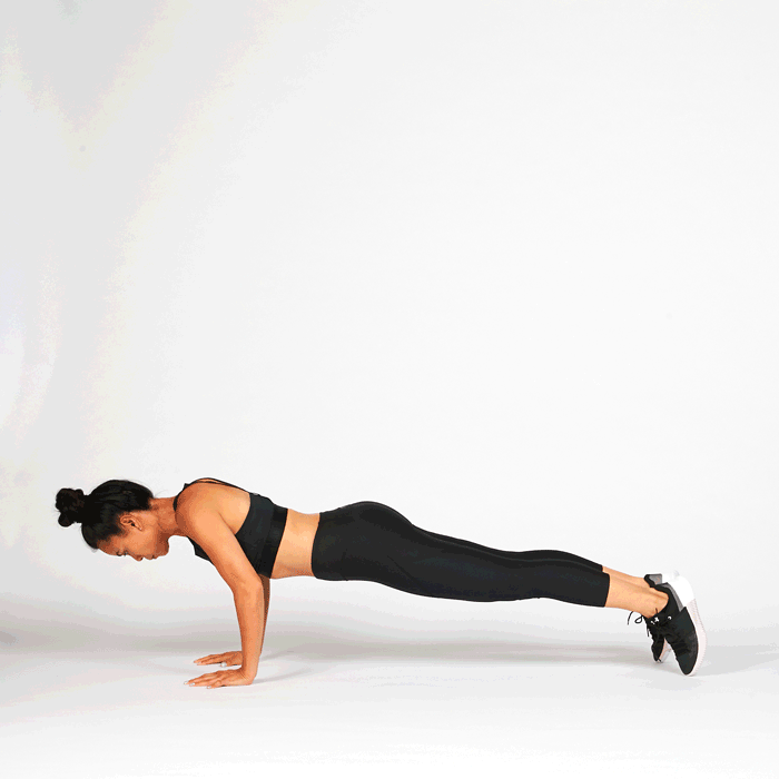 Vào tư thế chống đẩy với hai bàn tay cách nhau ngang vai. Giữ cho lưng dưới của bạn phẳng và đừng để hông bị chùng xuống. Hạ thấp bản thân và giữ khuỷu tay của bạn gần với cơ thể của bạn khi bạn hạ xuống.